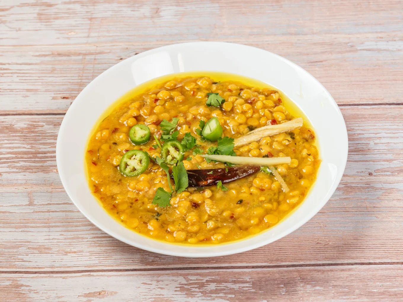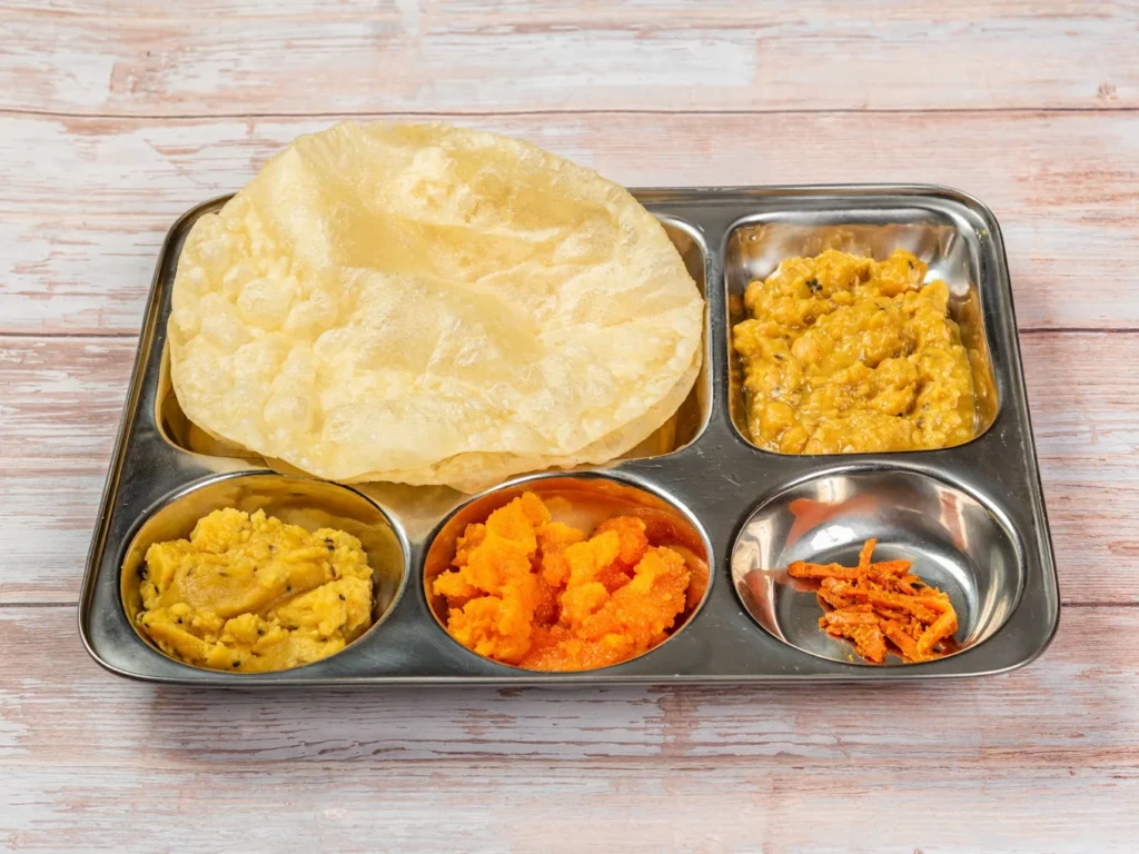 Two fluffy deep-fried Puris served with spicy Chana (chickpeas), Aloo Tarkari (potatoes), and sweet Halwa. Available all day.